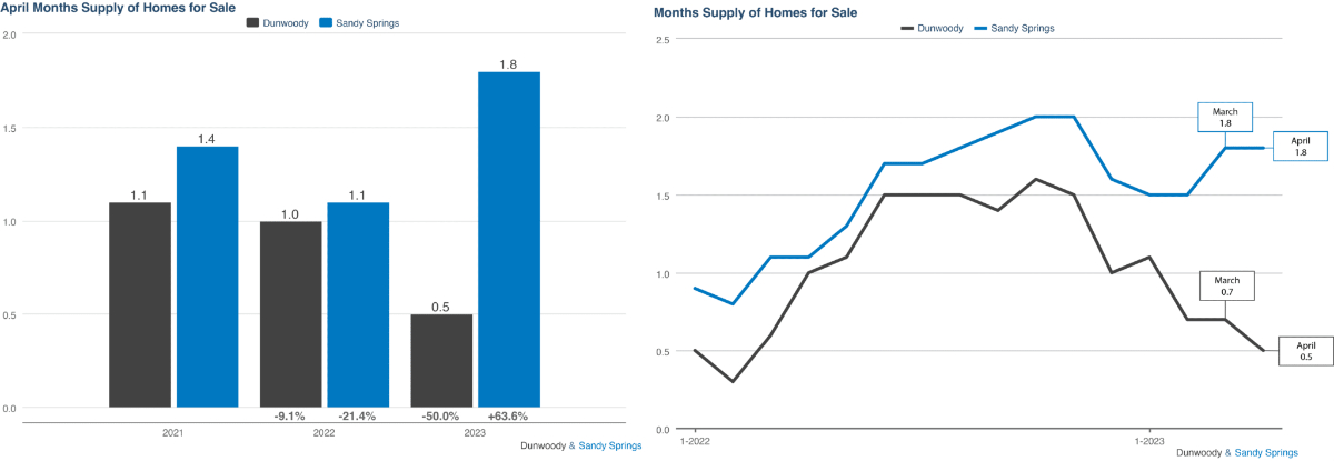 Sandy Springs saw no change in months supply remaining at 1.8 from March. Meanwhile, Dunwoody decreased slightly from 0.7 to 0.5 months supply, reflecting a 50% decrease compared to April 2022. This decline points to a tighter supply of homes in Dunwoody’s market.