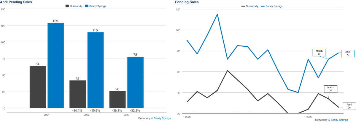 The number of pending sales in Sandy Springs showed further growth, rising from 72 in March to 78 in April. Conversely, Dunwoody experienced a decrease in pending sales, going from 34 to 26, representing a 23.53% decline. Comparing to April 2022, Sandy Springs witnessed a 32.2% decrease in pending sales, which totaled 115 at that time. Similarly, Dunwoody experienced a 38.1% decrease from April 2022 when there were 42 pending sales.