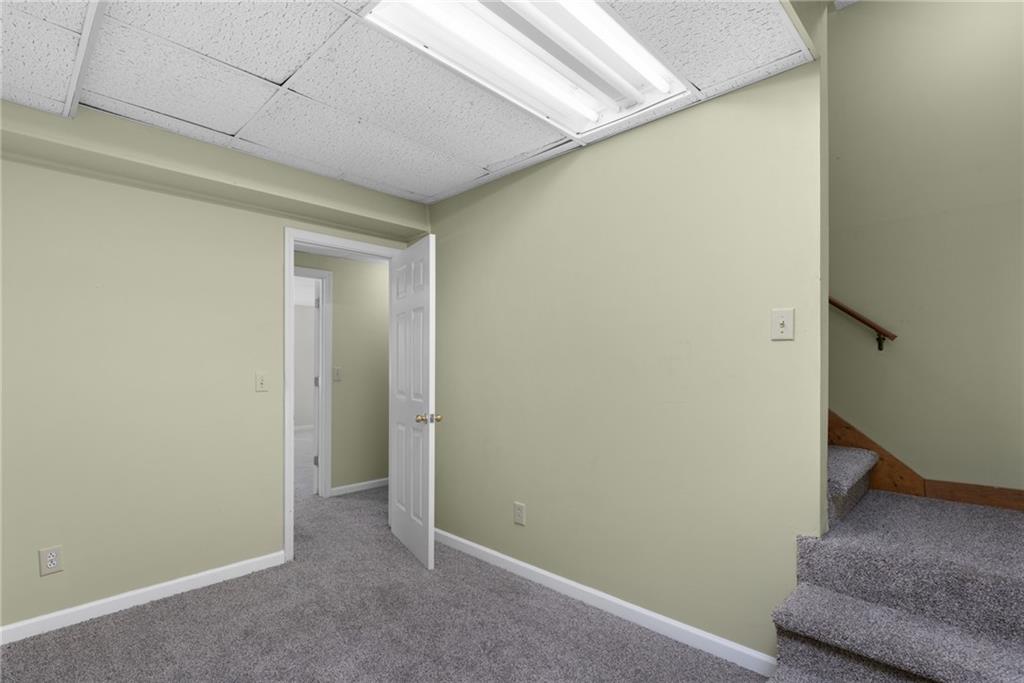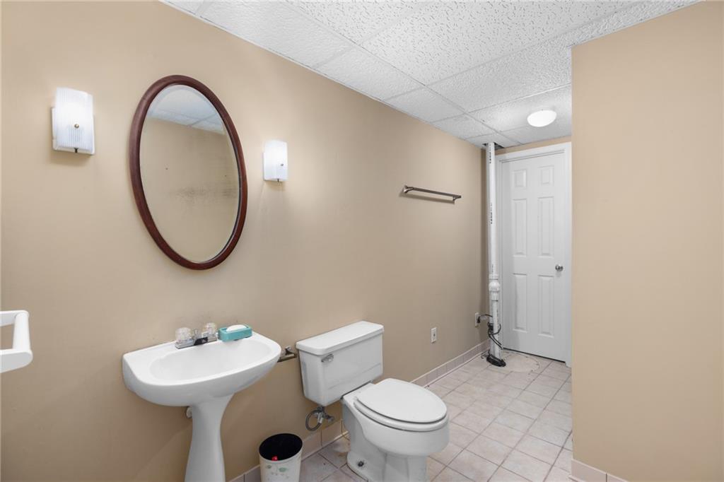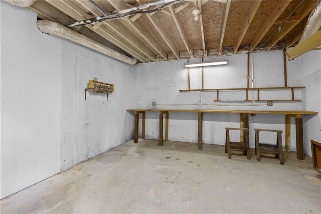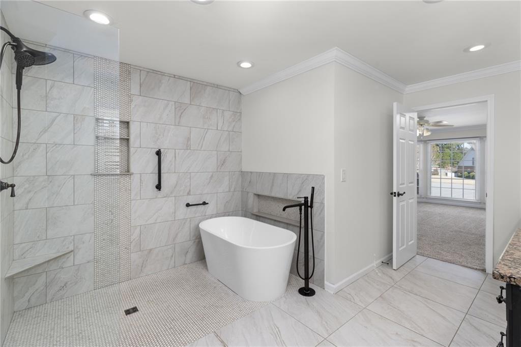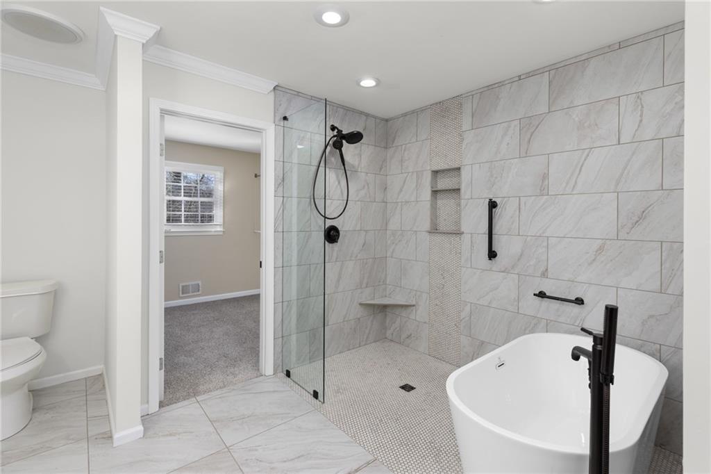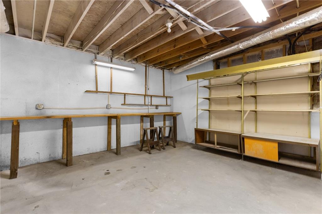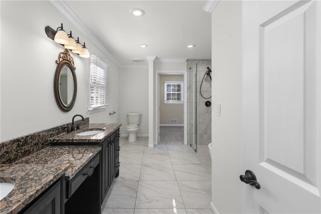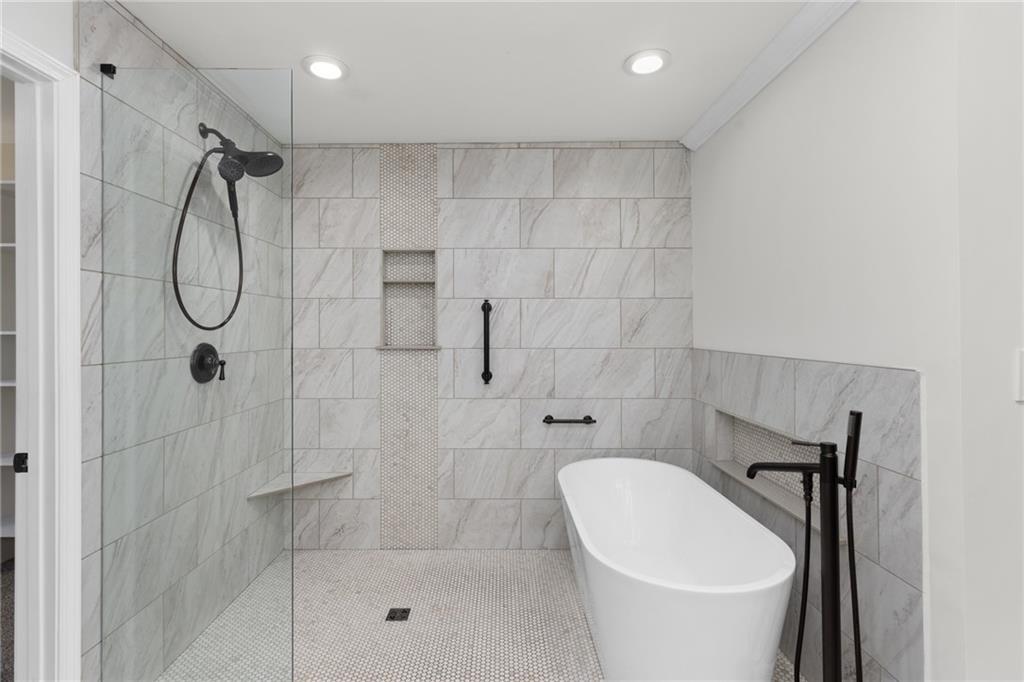 The spacious Master-on-Main retreat offers a serene escape, featuring a gorgeous fully renovated bath with double vanity dressing area, soaking tub, and separate shower—all designed with accessibility in mind, including wheelchair-friendly functionality. Upstairs are two additional bedrooms, a full guest bath, and a walk-in attic for convenient, stair-free storage. The partially finished basement expands the living space with a large multi-use room complete with a masonry fireplace and sliding glass doors to the backyard. Perfect as a media room, home office, gym, playroom, or even an in-law or nanny suite with a private bath. The terrace level also includes full bath, unfinished storage, a workshop, and a one-car garage with garage door opening to drive around driveway.