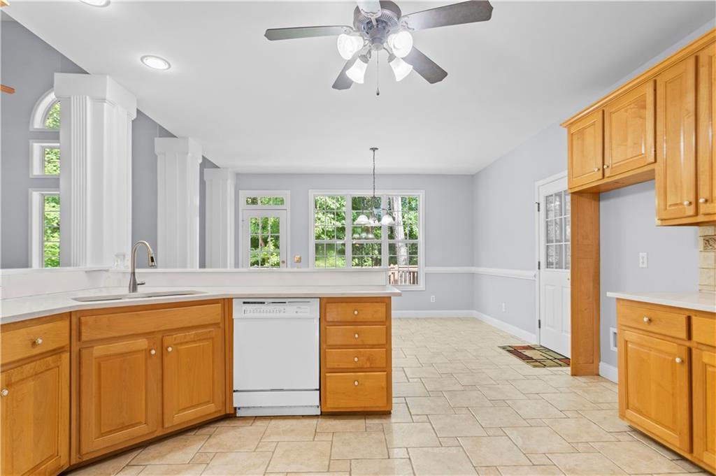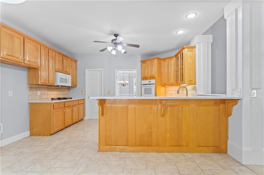 Breakfast Bar, Cabinets Stain, Eat-in Kitchen, Pantry, Pantry Walk-In, Solid Surface Counters, View to Family Room