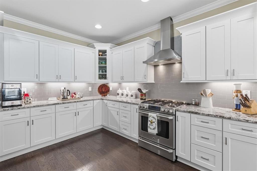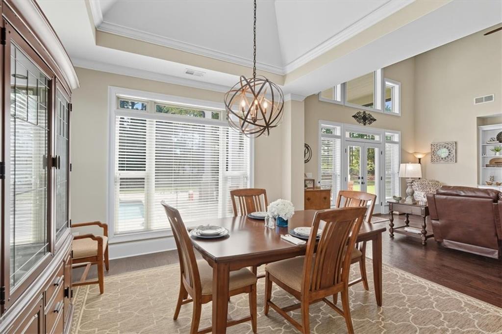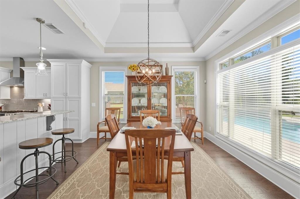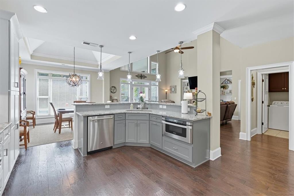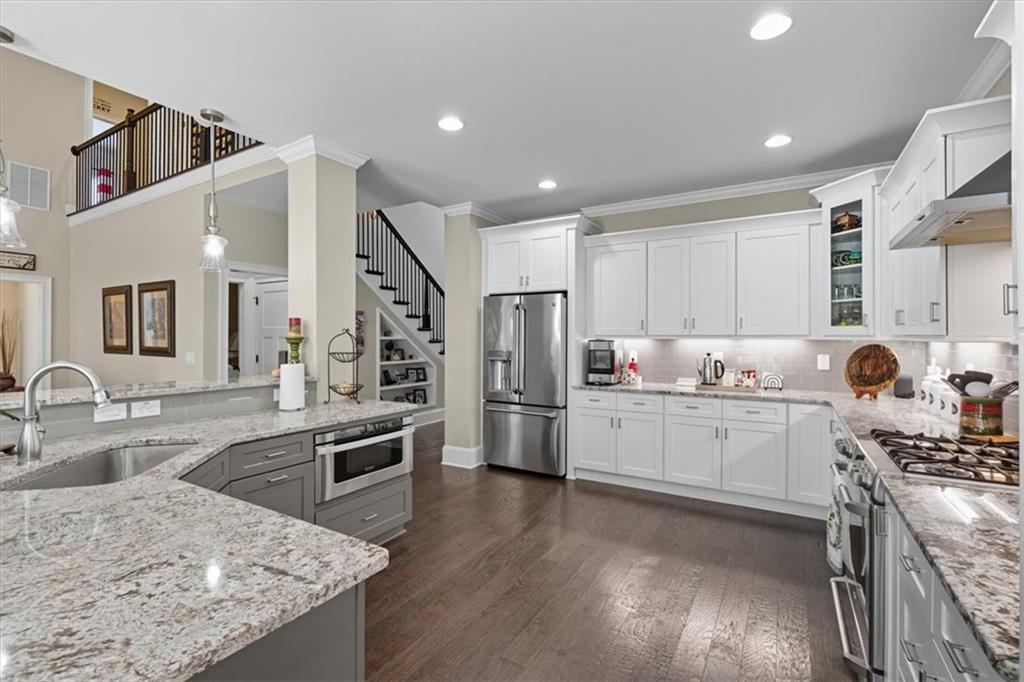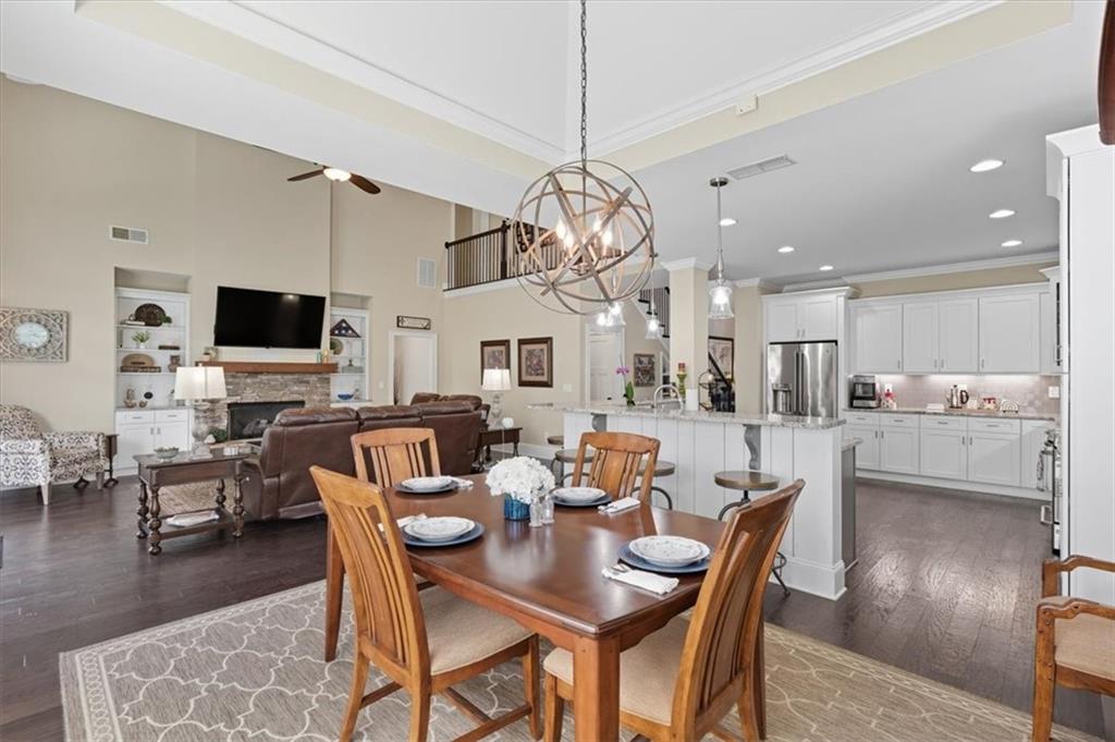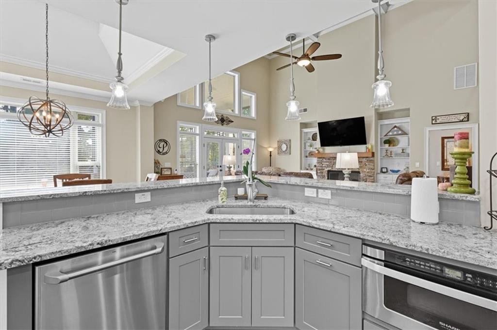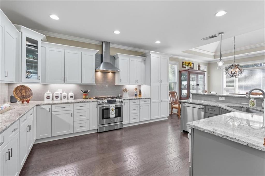 From the foyer you're welcomed with site lines to the Great Room and Kitchen. The great room offers tons of natural lighting, a custom brick fireplace and built-in shelving, providing a focal point for the space and seamlessly flows into the Gourmet Kitchen, where no detail was overlooked. This chef's dream includes tall, dovetailed and soft-close cabinetry, upgraded granite countertops offering tons of workspace, under-cabinet lighting, top-tier stainless steel appliances and a breakfast area/keeping room, highlighted by an illuminated tray ceiling, completing this magnificent culinary space.