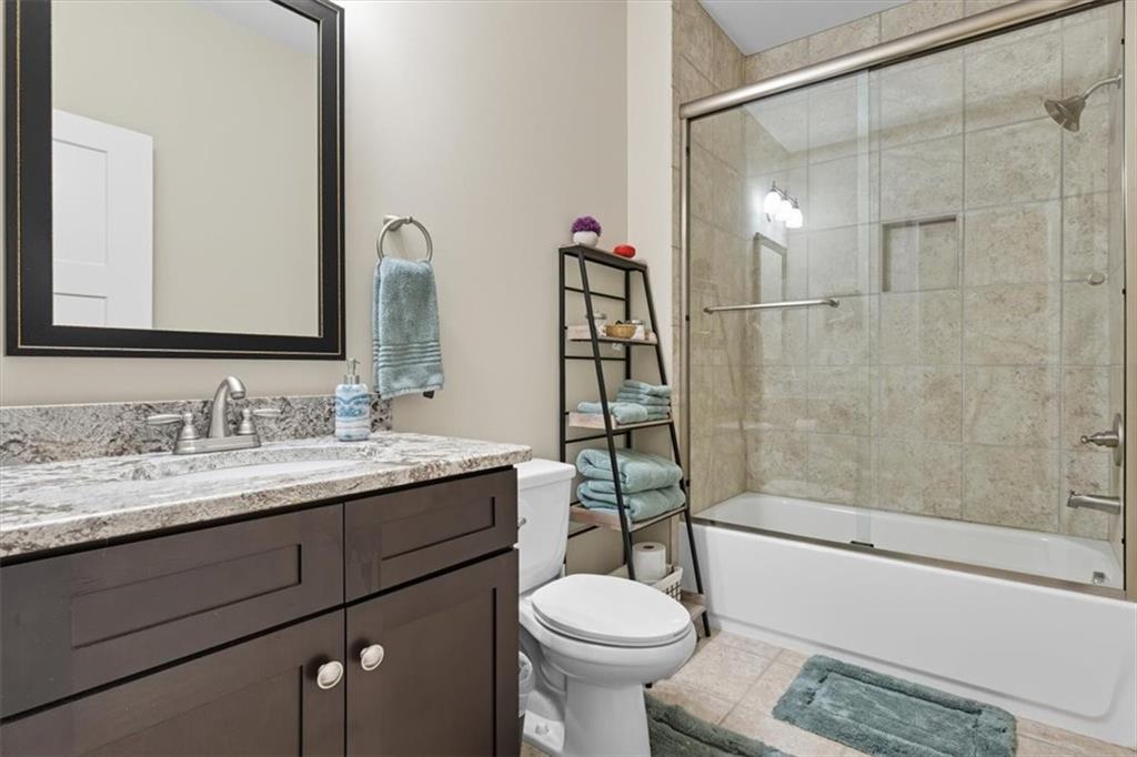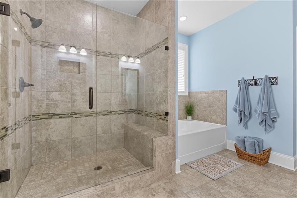The private Primary Suite is conveniently located on the main level, offering a peaceful retreat accented by a back-lit tray ceiling and large picture windows. The spa-like ensuite bath is a true sanctuary, featuring a soaking tub, a frameless tile shower, beautiful tower cabinetry, high-end granite, and private access to the large walk-in closet. The main floor is completed by a powder room for guests, a spacious laundry room with cabinetry, and garage access.