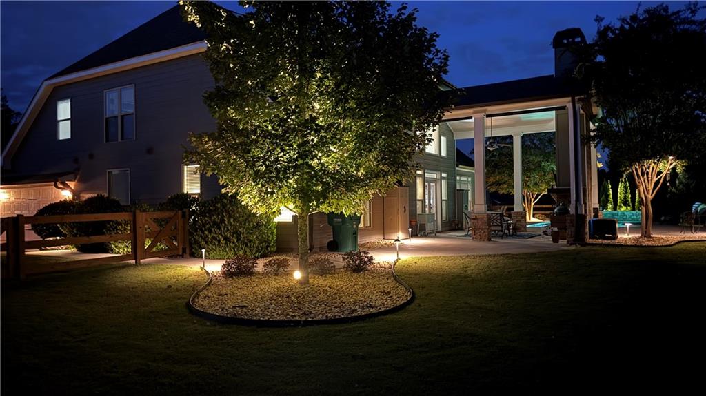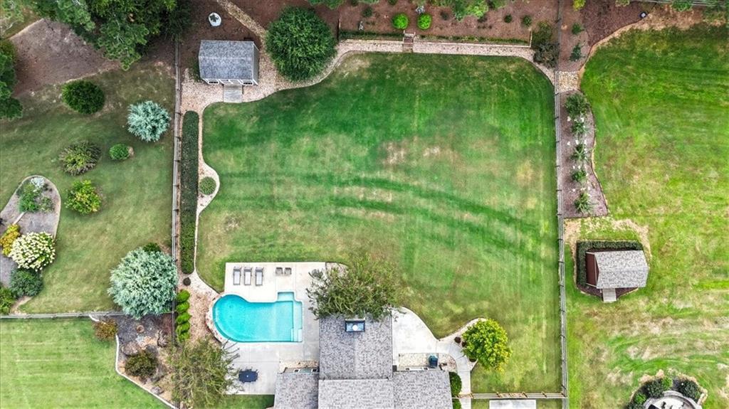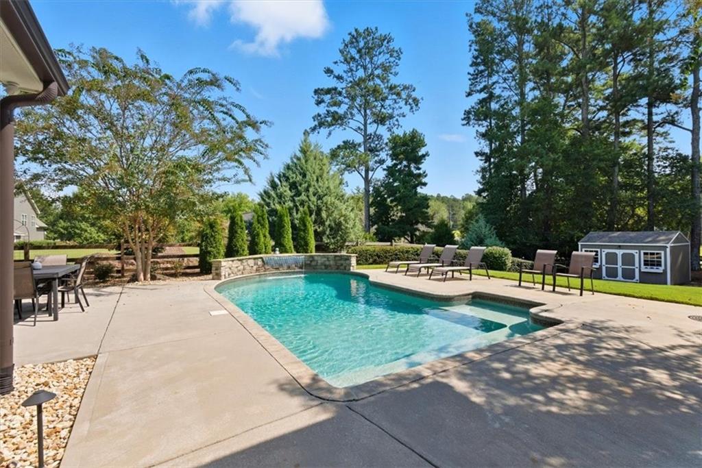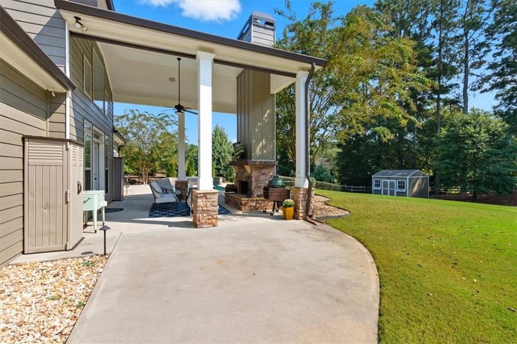 The highlight of this property is undoubtedly the private oasis situated on a professionally landscaped and level 0.75-acre lot. The backyard is a masterpiece of design, featuring a stunning SWIMMING POOL with a beautiful waterfall, surrounded by expertly installed hardscaping. Enjoy year-round entertaining on the luxurious covered patio, which includes a wood-burning fireplace. A custom storage shed, designed to match the home’s exterior finishes. At night the home is illuminated with an impressing exterior lighting package.