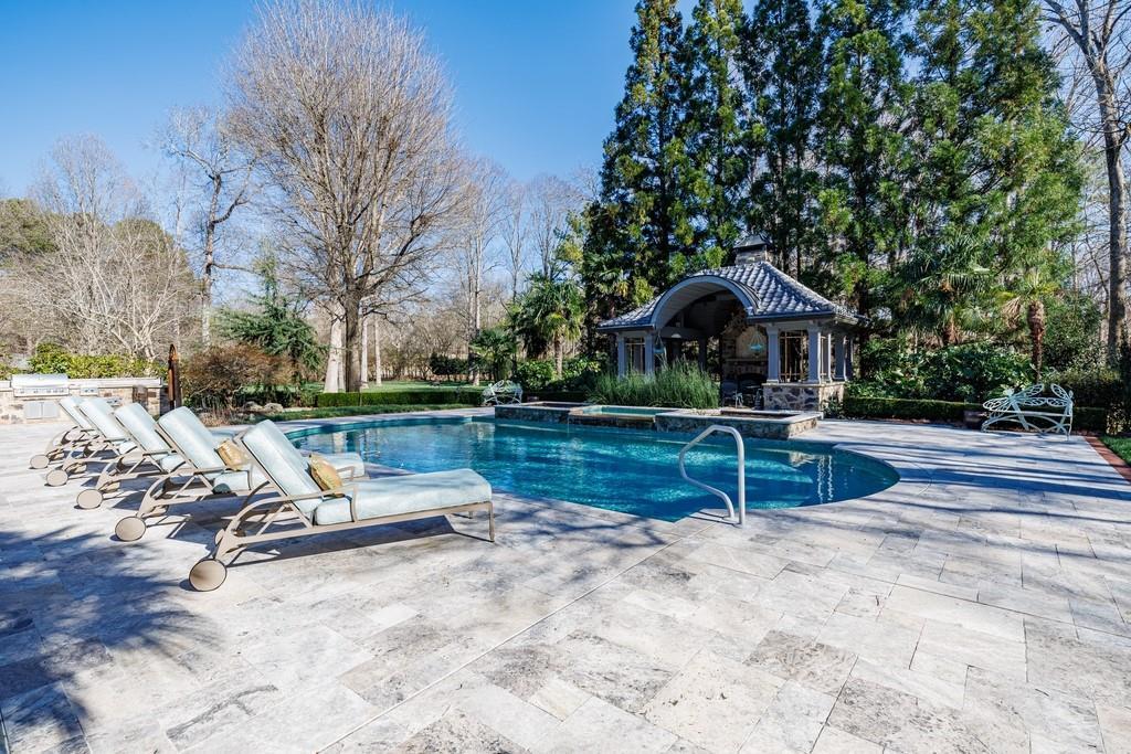 The finished terrace level is ideal for entertaining, with multiple living areas and a kitchen opening to the pool and grounds. A full wellness center includes a sauna, pool bath, exercise room, and massage room. Outdoors, enjoy the poolside covered gazebo with fireplace.