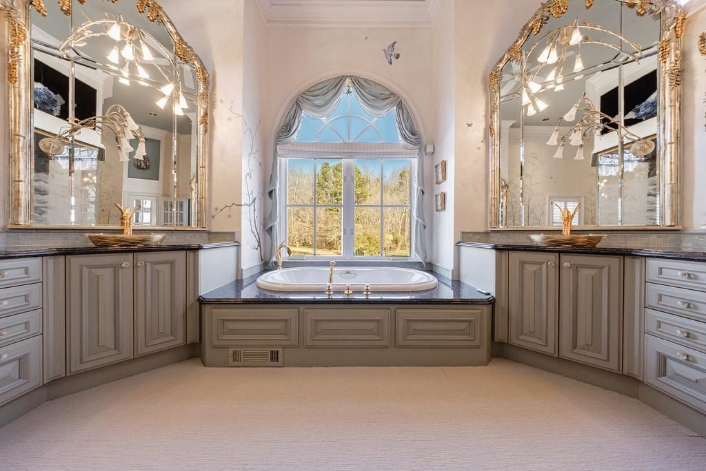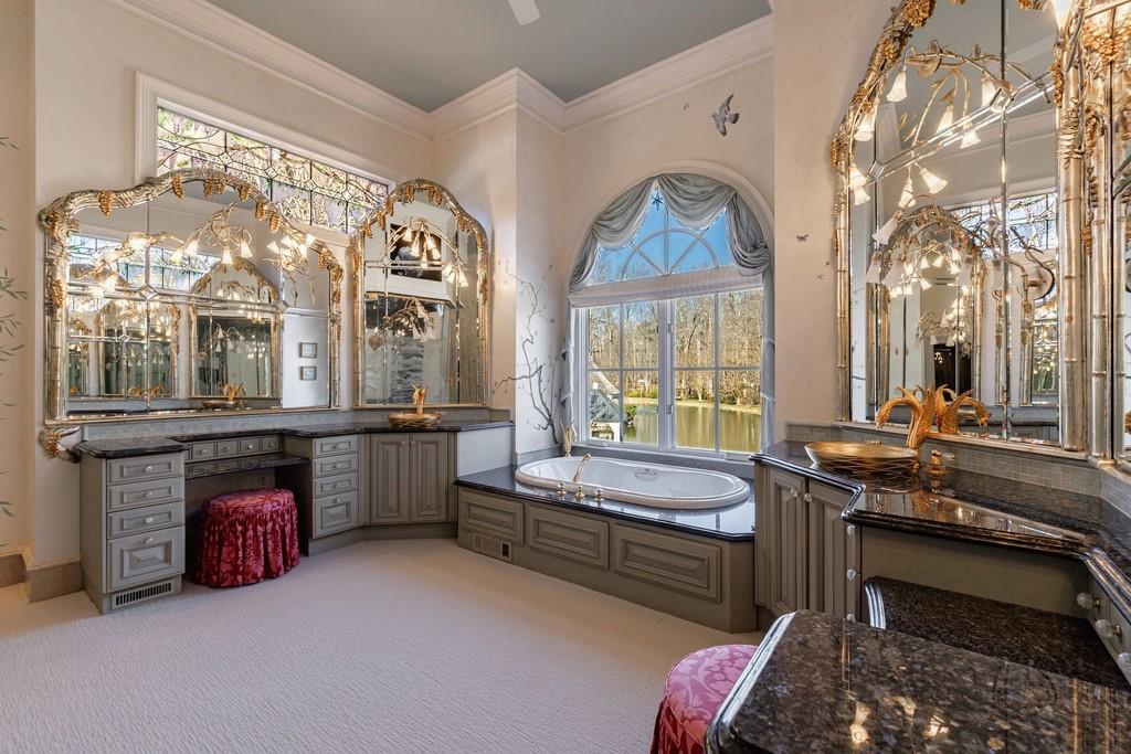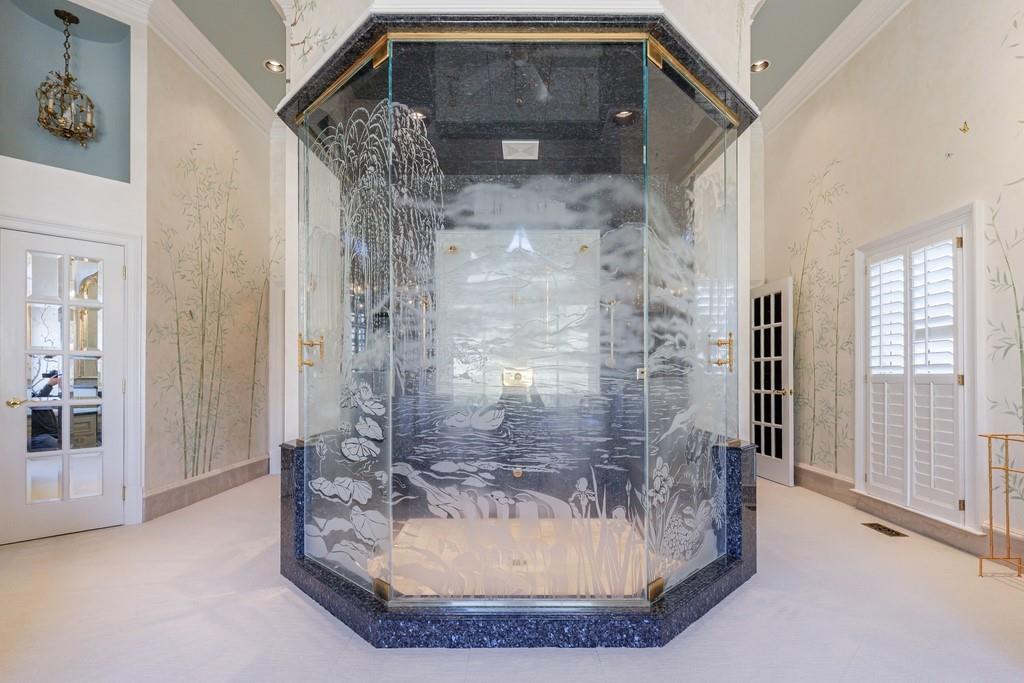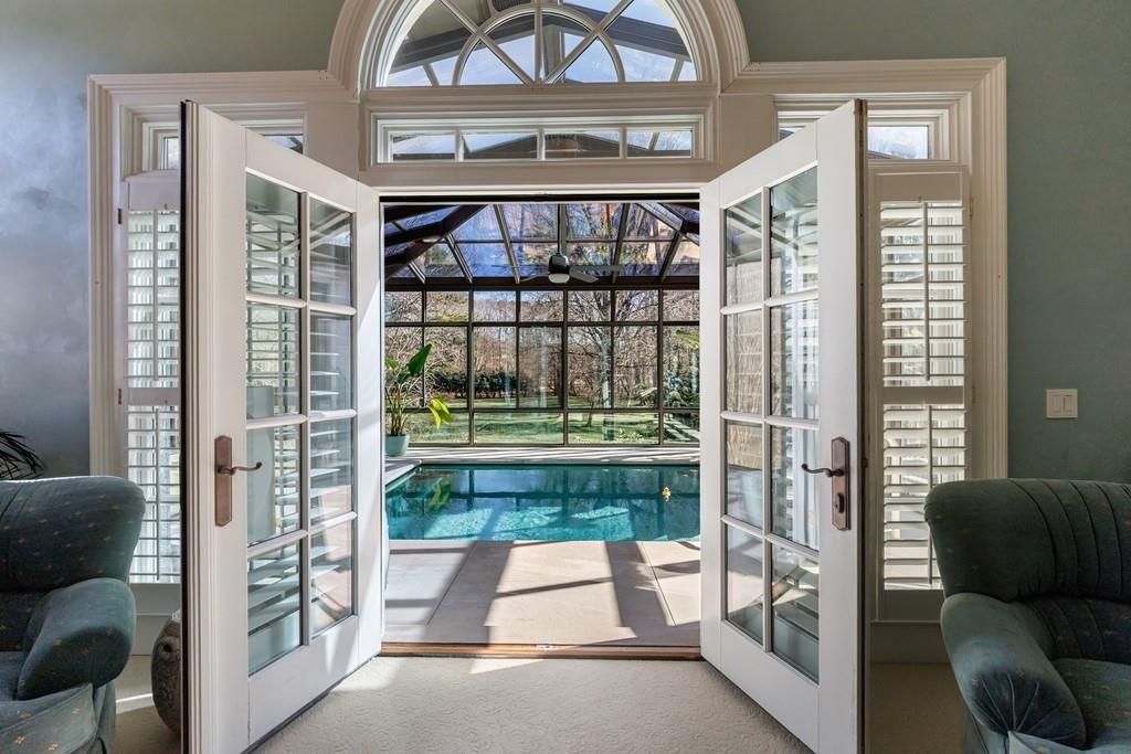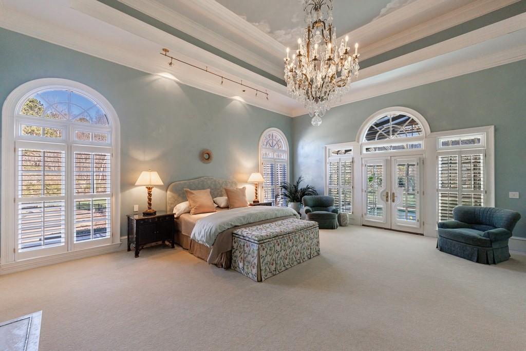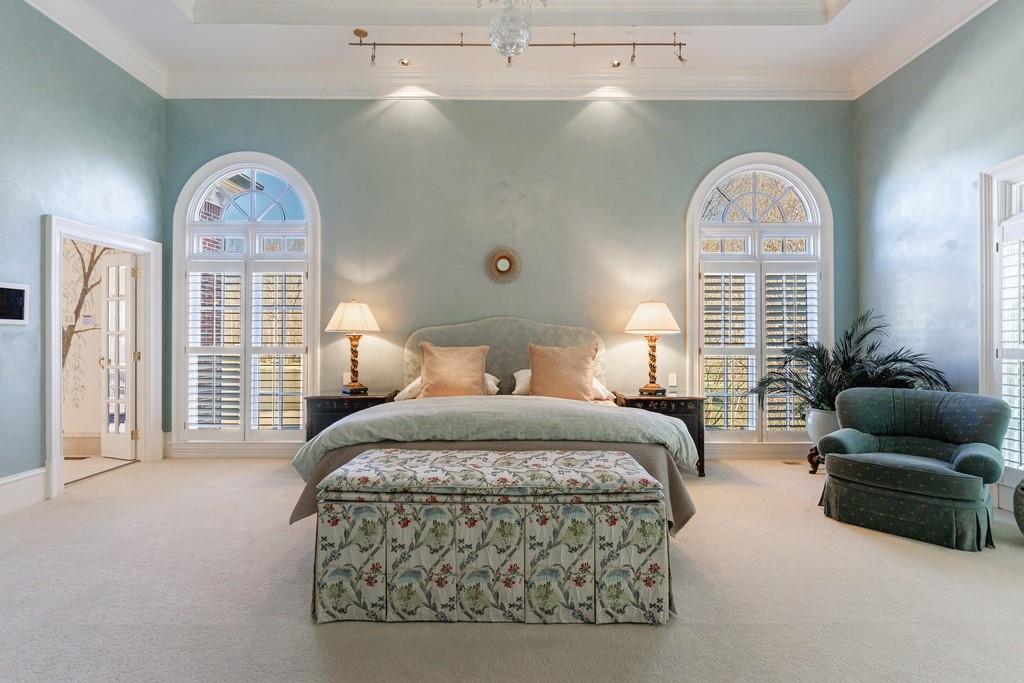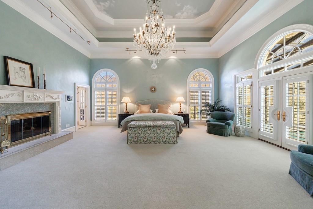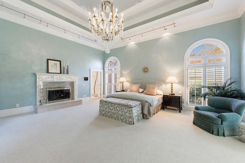 The primary suite, occupying the entire left wing of the home, is a private sanctuary featuring a gracious sitting room and direct access to the indoor pool. The suite boasts a tray ceiling, fireplace, and a spacious bath with serene views of the pond and gazebo. Two separate walk-in closets offer exceptional storage, complemented by dual vanities, a large shower, soaking tub, and two water closets.