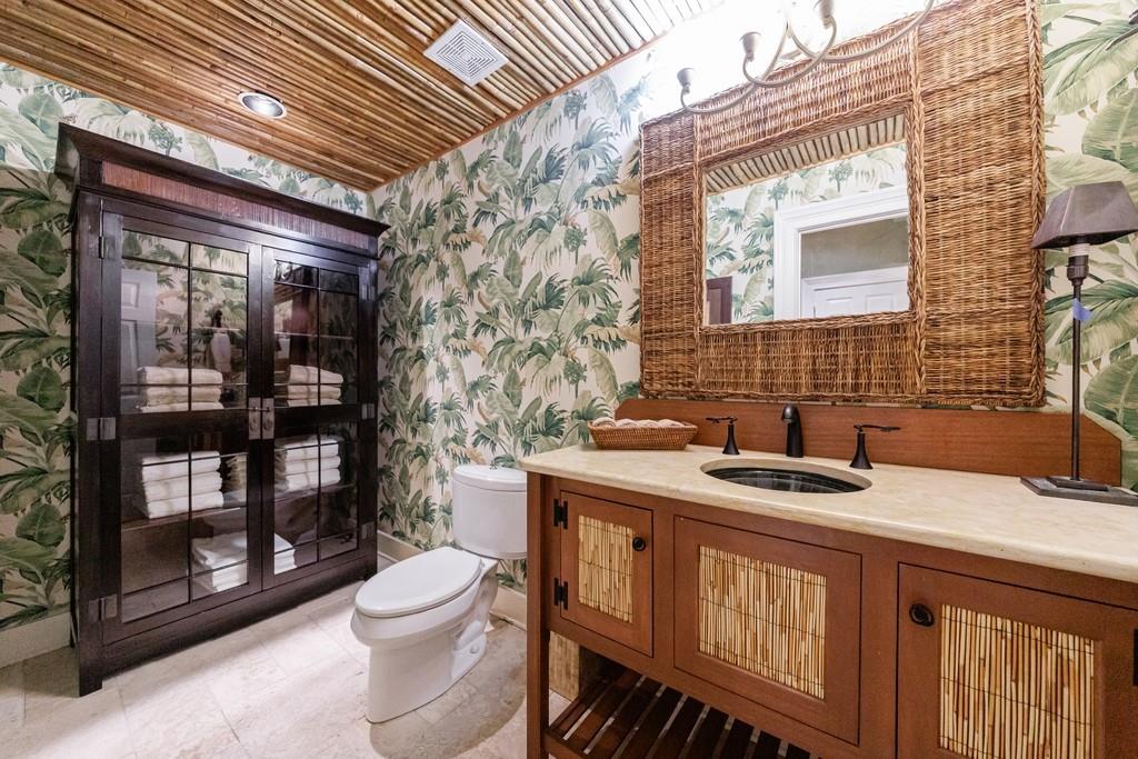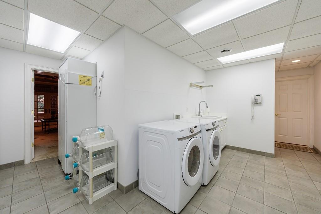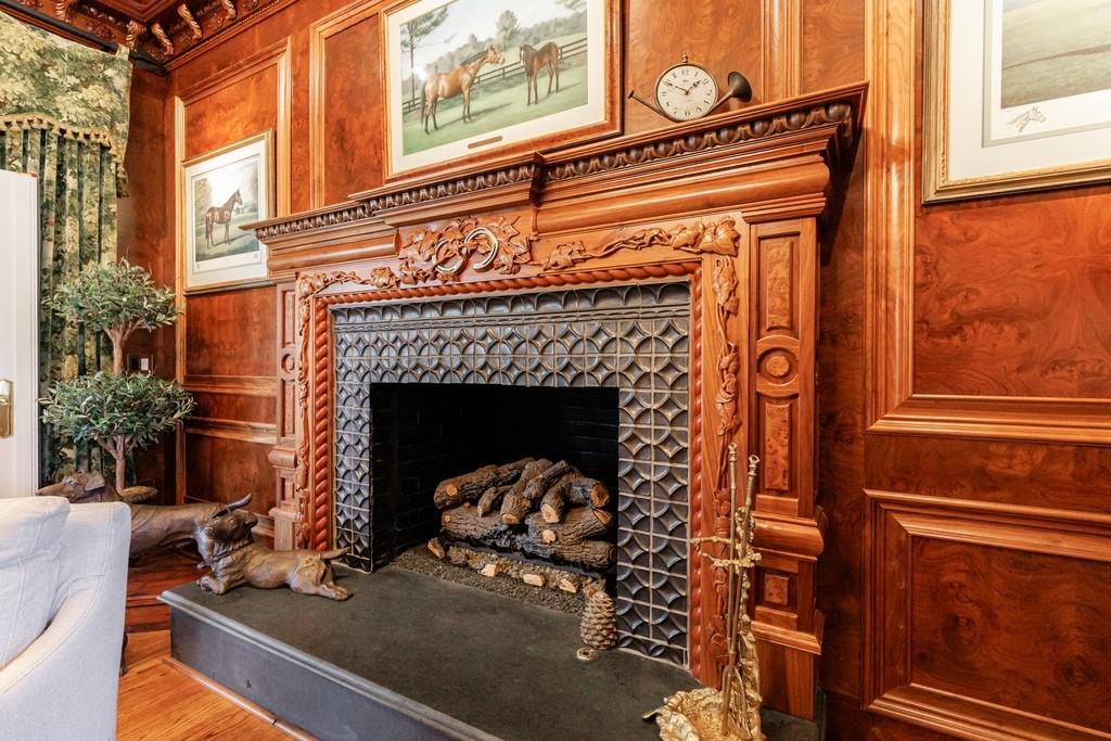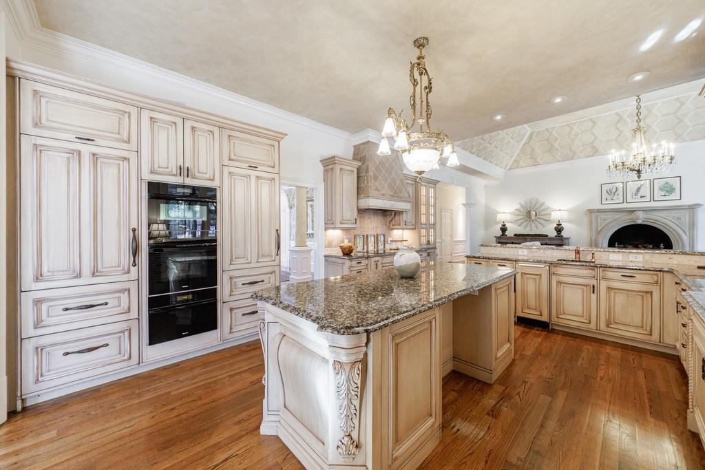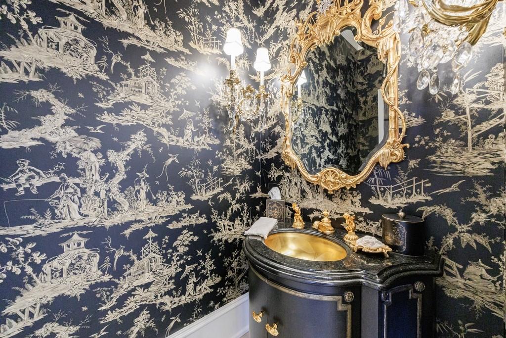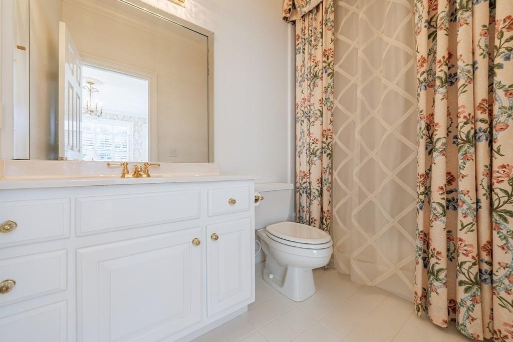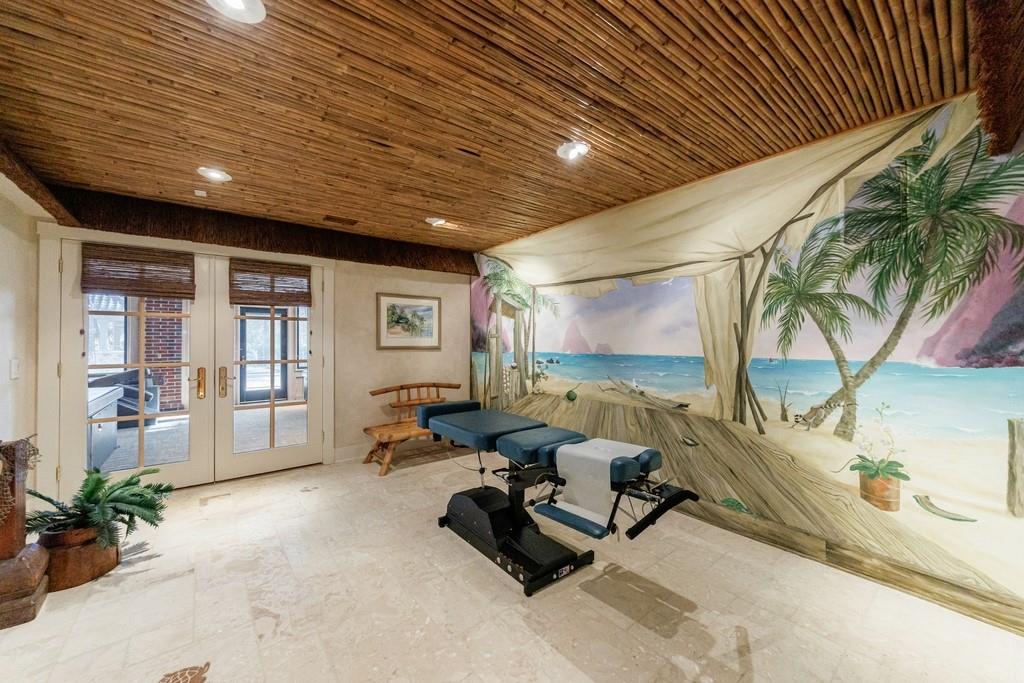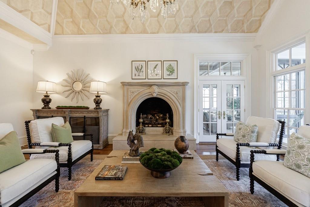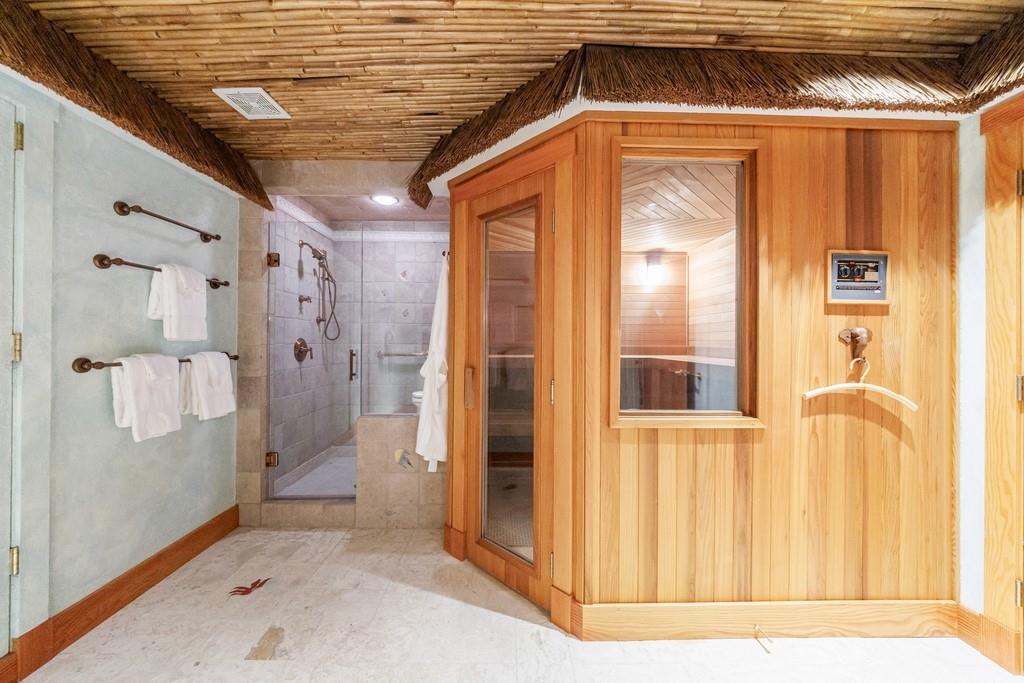 The primary suite, occupying the entire left wing of the home, is a private sanctuary featuring a gracious sitting room and direct access to the indoor pool. The suite boasts a tray ceiling, fireplace, and a spacious bath with serene views of the pond and gazebo. Two separate walk-in closets offer exceptional storage, complemented by dual vanities, a large shower, soaking tub, and two water closets.