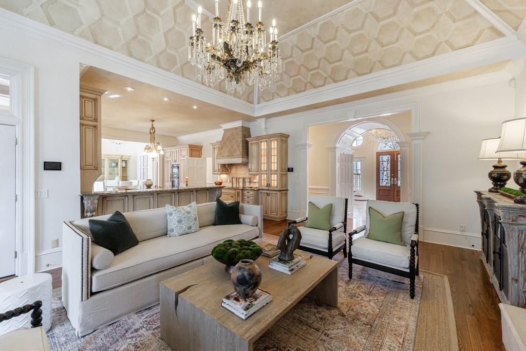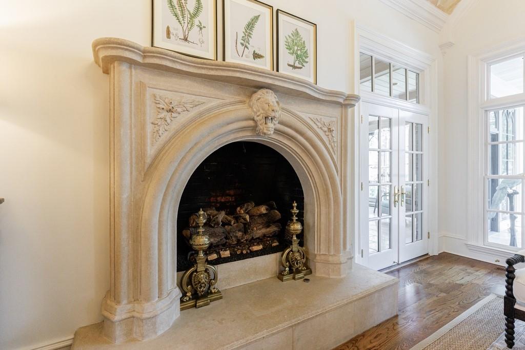 Inside, a grand foyer welcomes you with beautiful stone flooring and exquisite crown molding. The main level features expansive living spaces designed for effortless entertaining. Formal living and dining rooms anchor the front of the home, while the kitchen opens seamlessly to the breakfast room and great room with fireplace. A richly appointed wood-paneled study showcases custom built-in bookcases and its own fireplace.