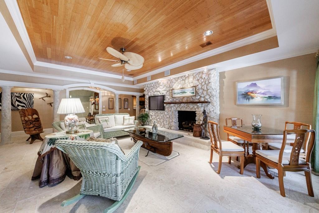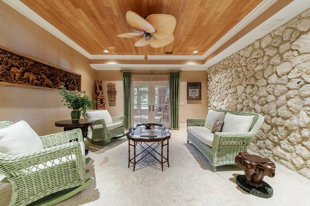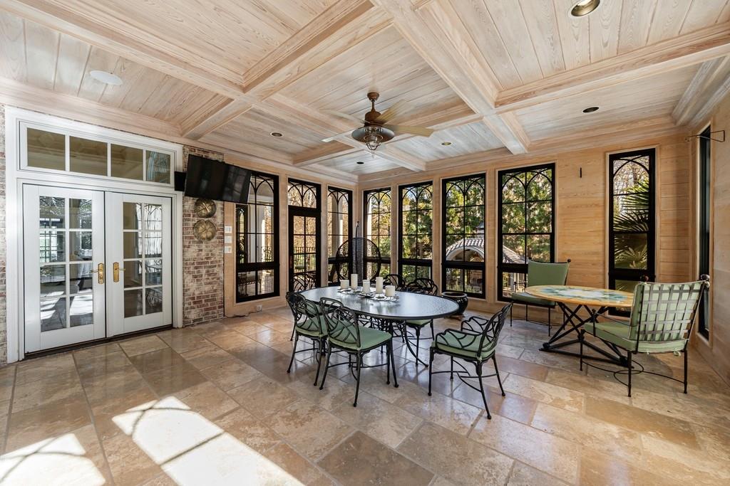 The most captivating spaces are the two rear rooms overlooking the grounds and pool: one a glass-enclosed sunroom filled with natural light, the other mirroring its design as a screened retreat—both ideal extensions of the great room and kitchen for entertaining and relaxation.
