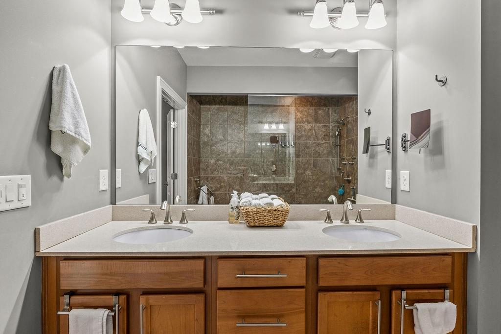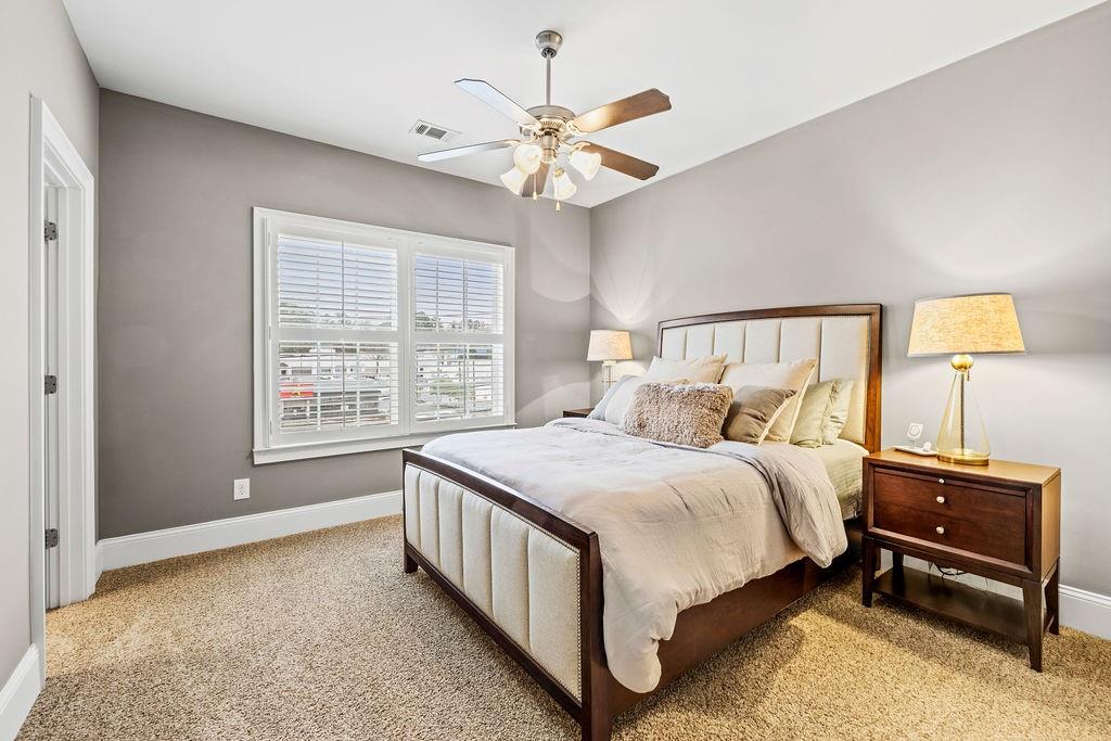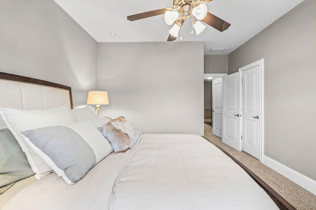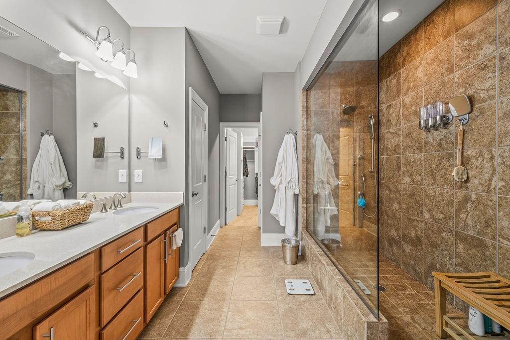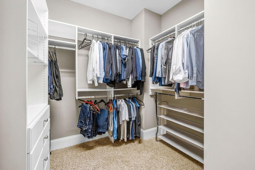 Upstairs, the primary suite is a true retreat with exposed beams, soft ambient lighting, and space for a sitting area. The spa-like bath includes a double vanity, oversized shower, generous linen storage, and a custom California walk-in closet. A secondary bedroom with its own private bath and walk-in closet, plus a conveniently located laundry room, adds everyday ease.